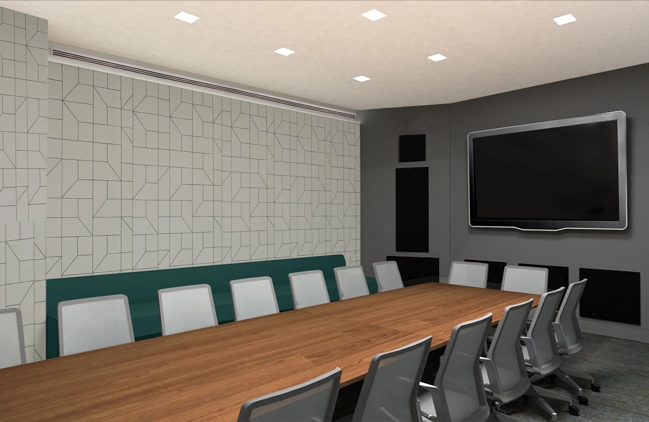 Conference Room featuring custom perimeter seating and light fixture.