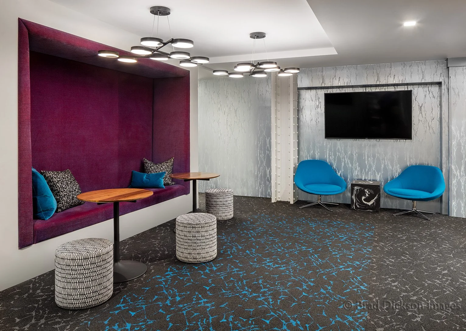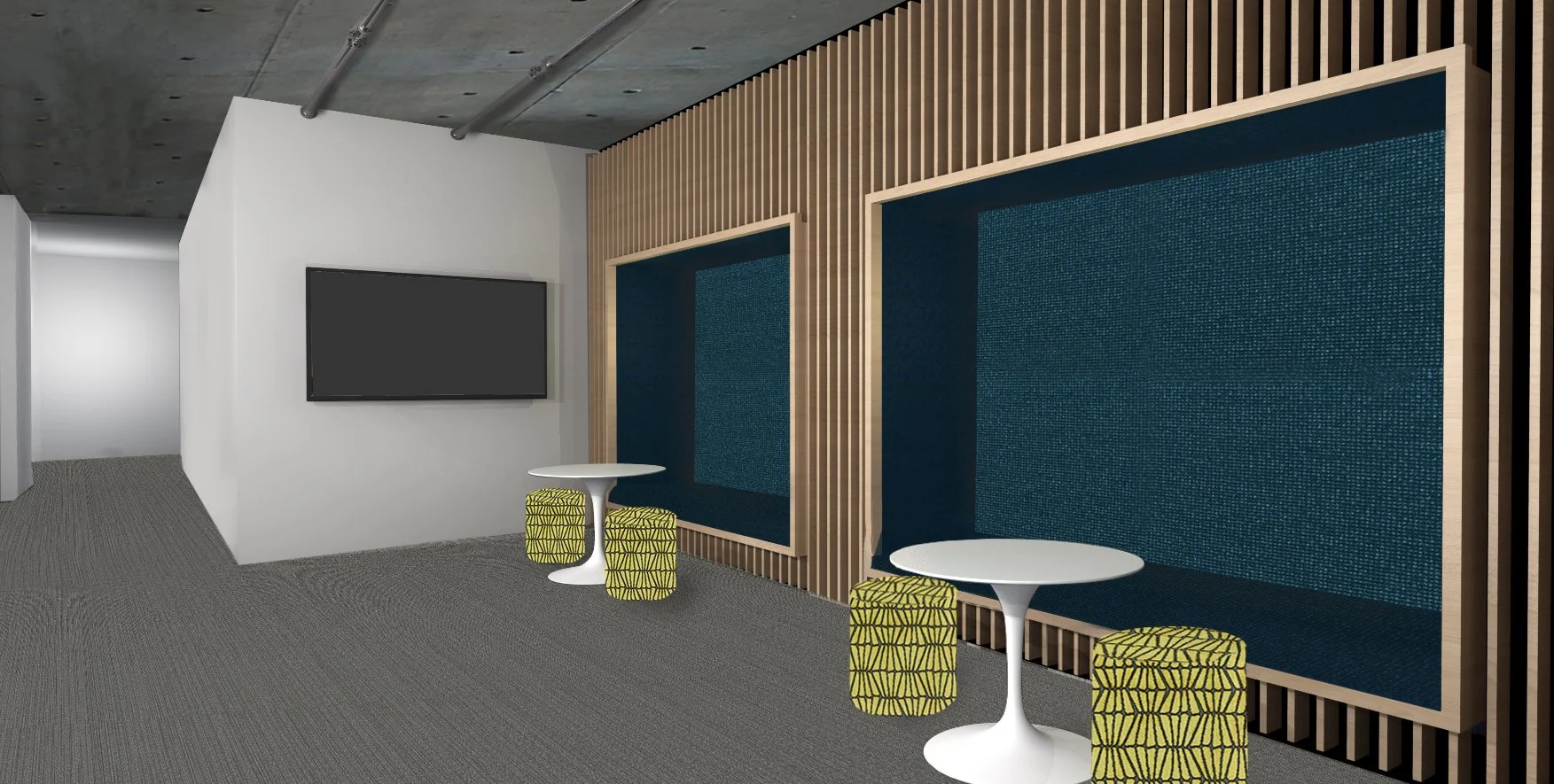 This Lounge is located right across from the Performance Lounge. The idea of corrugated metal follows through the open spaces.