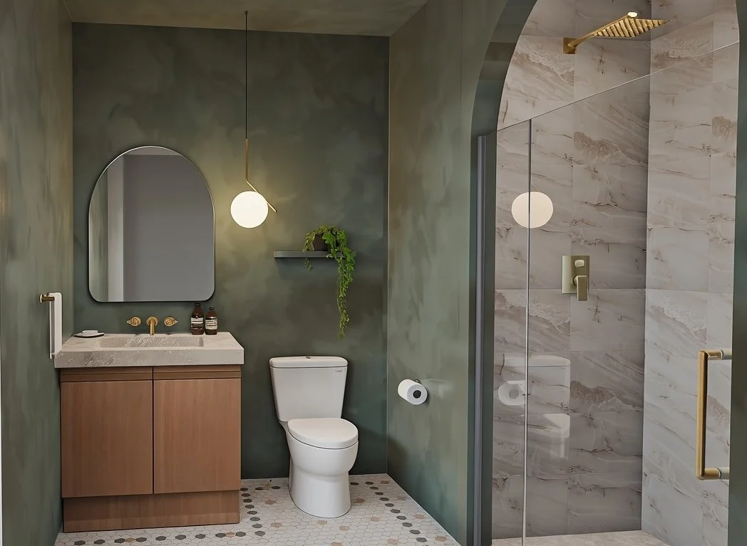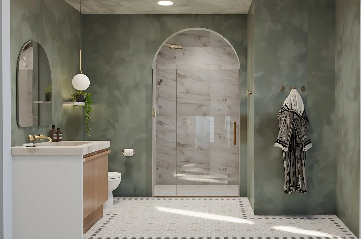 A full bathroom redesign concept rooted in quiet drama. Venetian plaster walls in sage green create an immersive, organic backdrop for an arched walk-in shower clad in marble. Warm wood, brushed brass, and penny tile flooring bring texture and warmth to every surface. This space was designed to feel like a retreat — unhurried, considered, and unmistakably personal.