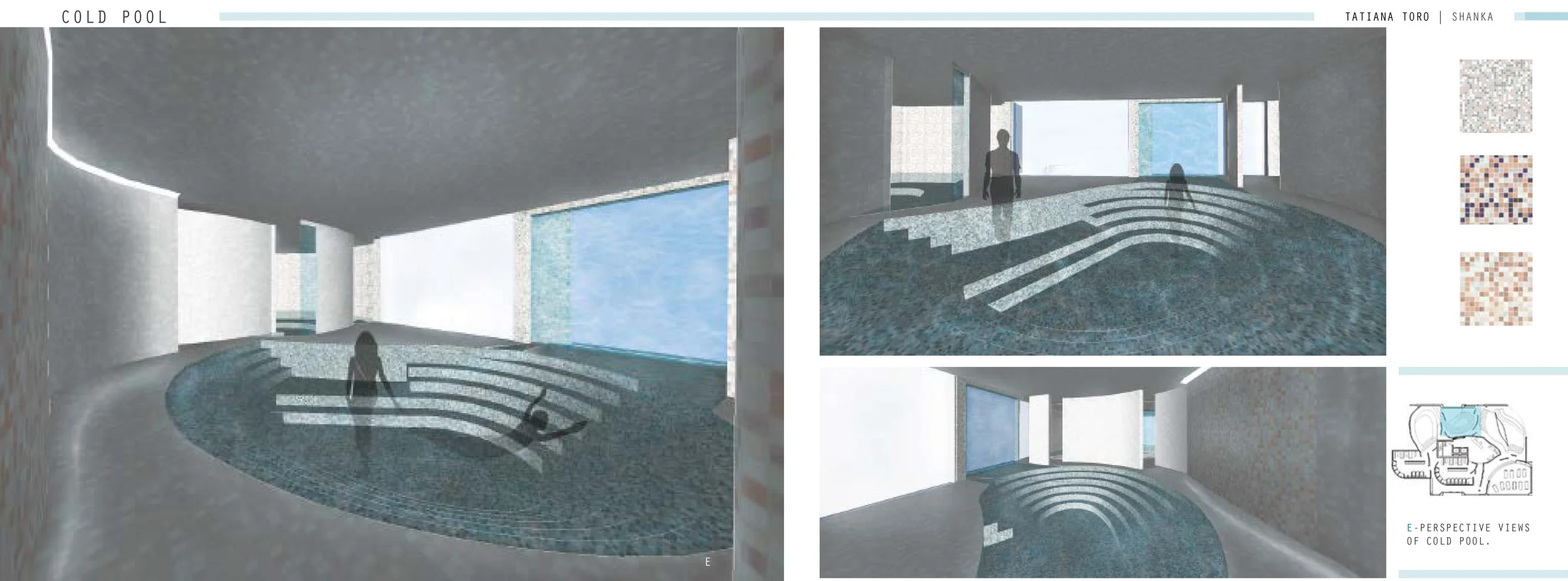 The program requirements for this project consisted of designing a Bath House with 3 major pools: cold, hot and a plunge pool - as well as a sun room, lockers / bathrooms and a reception area. A very important requirement was that each pool needed 3 exits and 3 entrances, women's and men's lockers rooms should have a dedicated entrance and a dedicated exit, and we could only design 3/4 of the building space for this bath house.