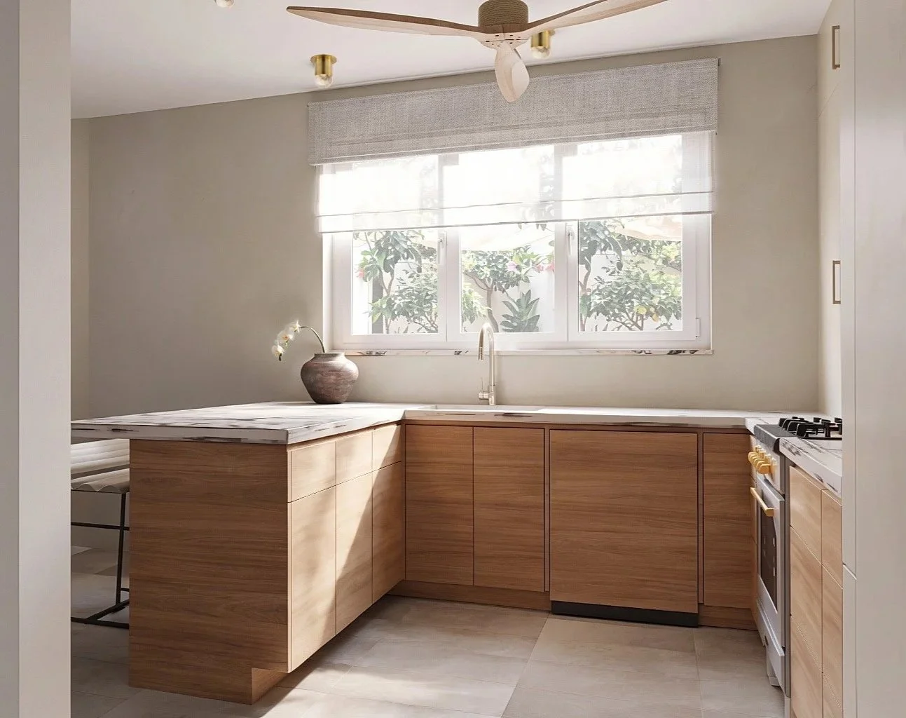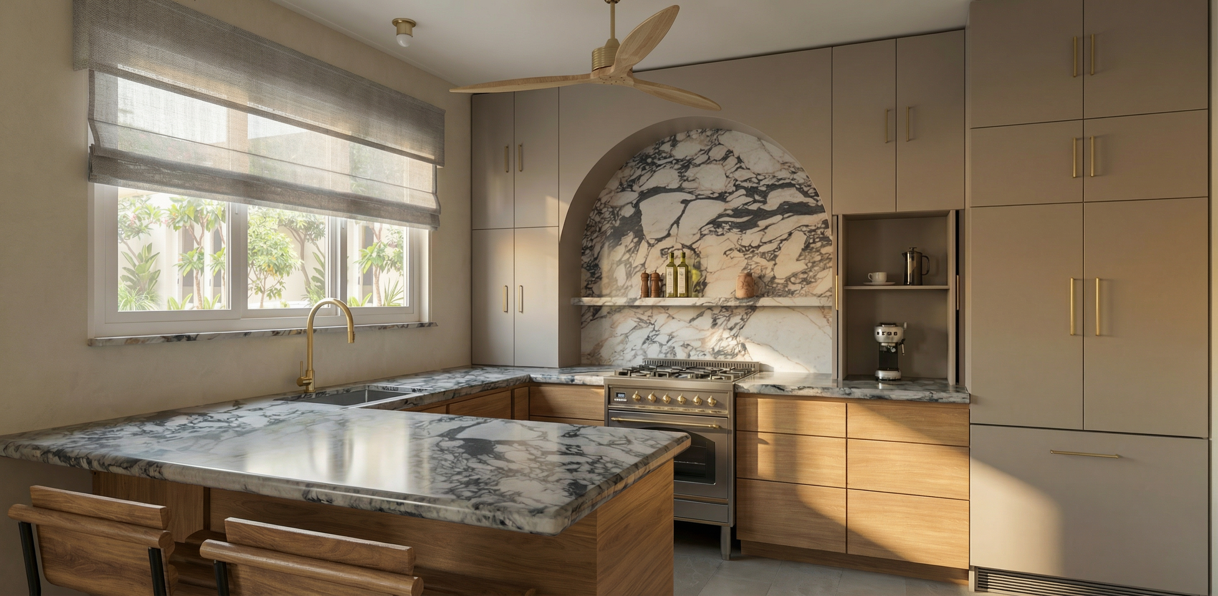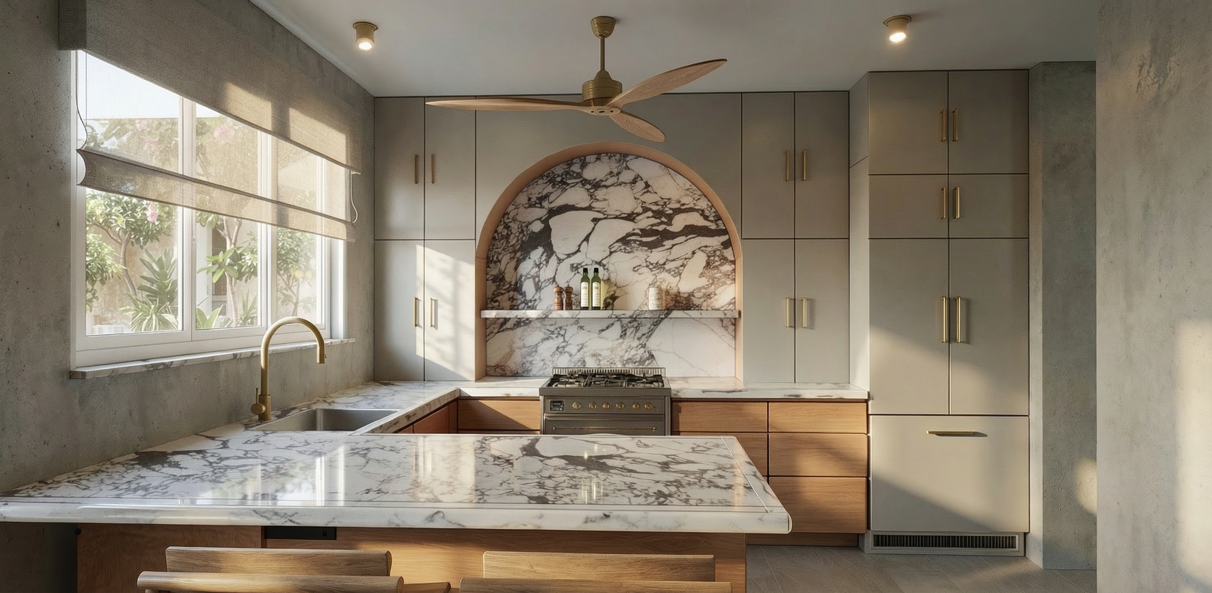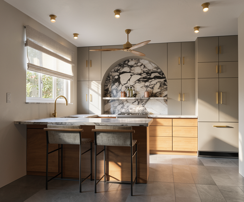 This kitchen redesign was driven by two goals: creating a more functional space and completing the home's story. The result reveals the homeowners' quiet, artistic sensibility — a muted color palette that yields to the striking Calacatta Viola marble and the arched architectural detail above the range.Behind the scenes